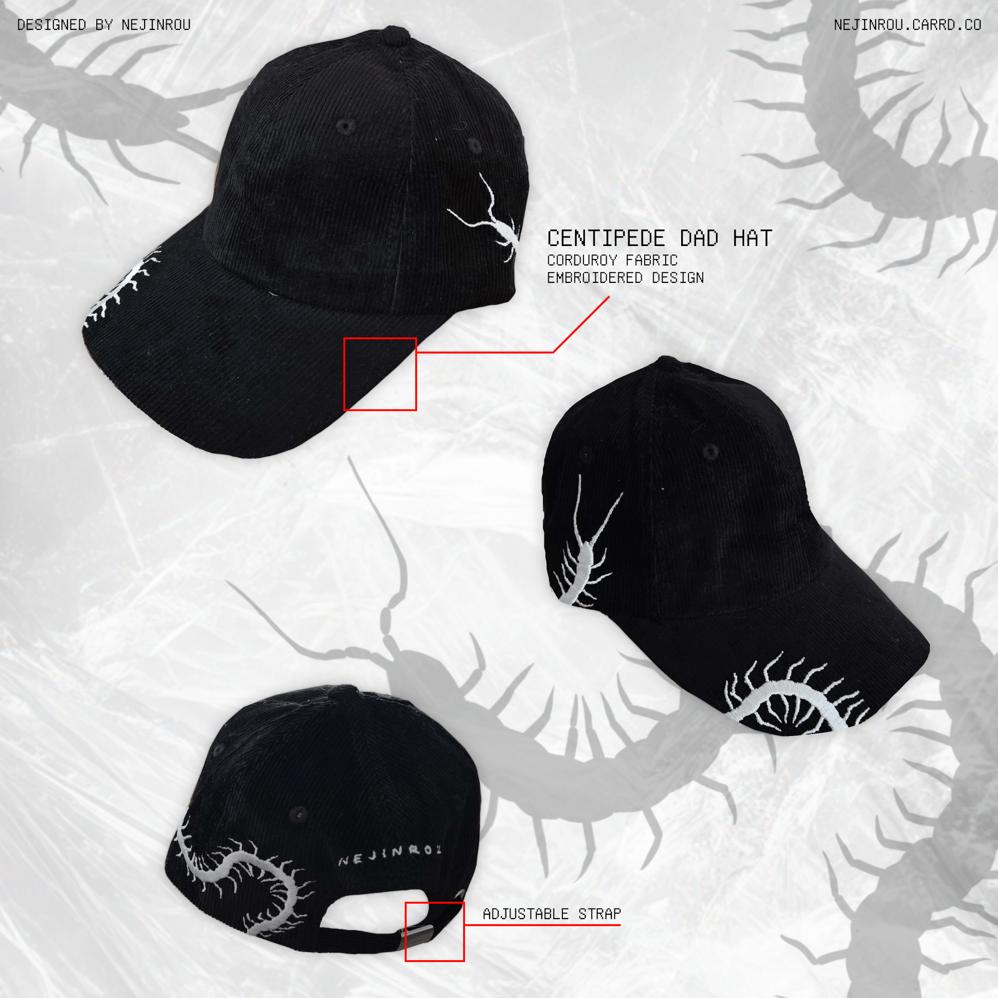 a dad hat embroidered with a centipede design. made of durable corduroy material, and featuring an adjustable strap.