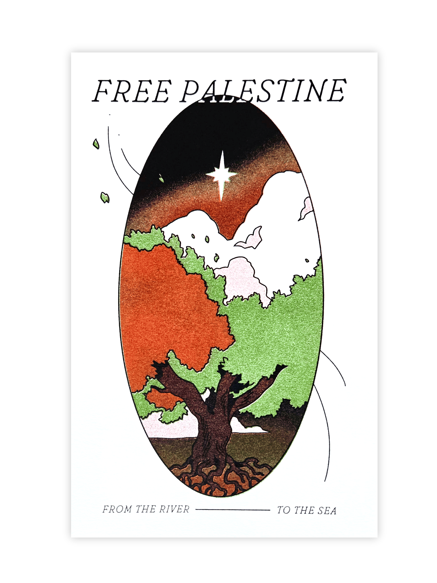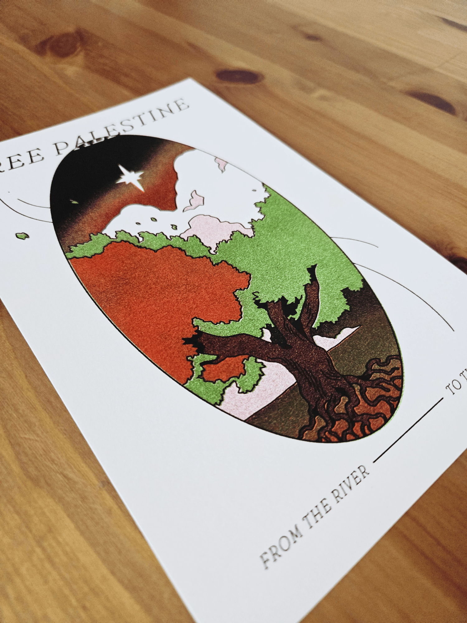 a risograph print featuring a palestinian olive tree. all proceeds are matched by the artist and donated to the palestine children's relief fund (https://www.pcrf.net/).